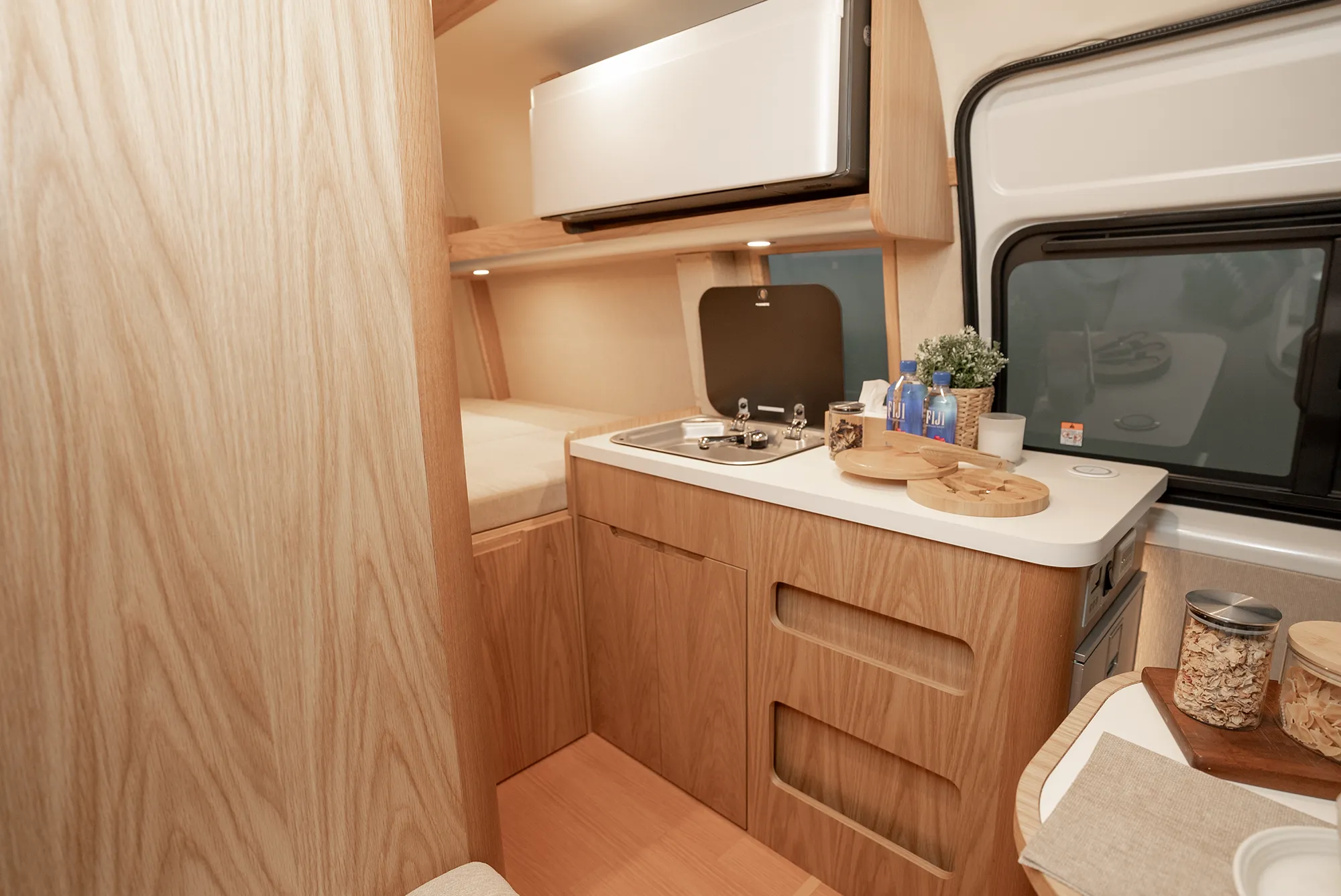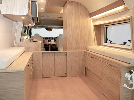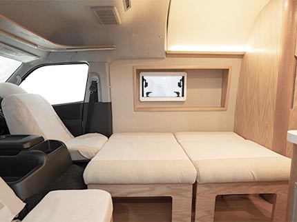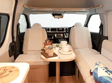 停車時にフロントシートを前に倒すだけで、ダイネットと向かい合うことができます。スペースをムダなく使い、広々としたリビングスペースを実現します。