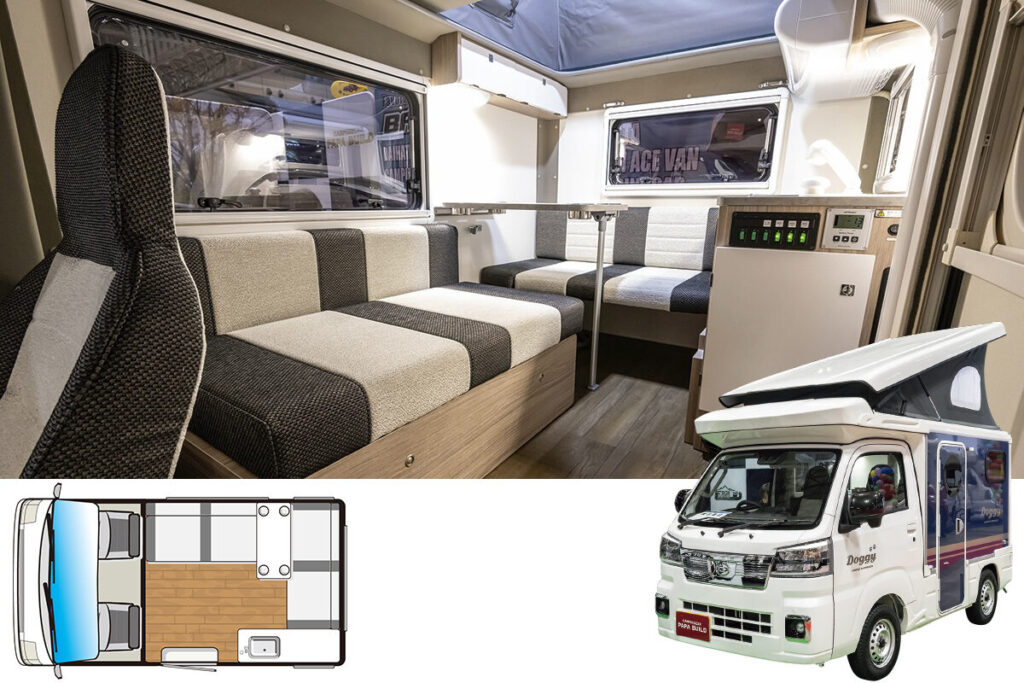 オリジナル装備のレザー調シートをオプションで用意し高級感のアップを可能としている。ドギーのレイアウトには対面(Type-S)と横座りソファ(Type-L)の2タイプがあり、それぞれにスタンダードとEVOグレードを用意。EVOにはリチウムイオンサブバッテリーに加えて超急速充電システム、DC12Vクーラーが標準装備され、ワンちゃんとの旅も快適な仕様。キッチンキャビネットはシンクに加え蛇口部分が引き出し式シャワーになっており、窓から外へ出して使うことが可能。EVOグレードはキッチン上部にクーラーを装備。